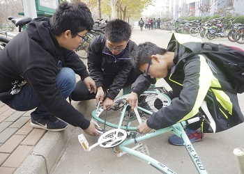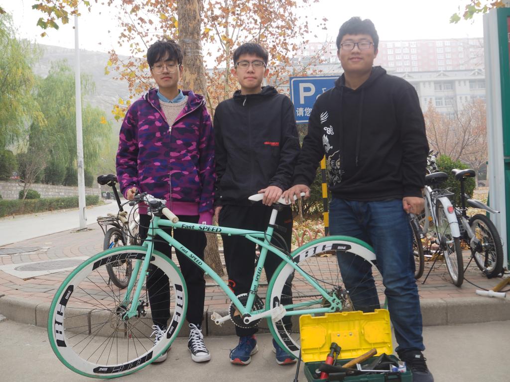 活動(dòng)開展前,各志愿者已準(zhǔn)備就緒,工具很快檢查完畢。縱然寒風(fēng)刺骨,仍擋不住修車隊(duì)員的熱情,沒一會(huì)兒,很多慕名而來的同學(xué)都推著自己的愛車前來求助。補(bǔ)胎,剎車不靈待調(diào)等情況,這些問題都在志愿者們默契的配合下都得了解決。但在接近尾聲的時(shí)候,遇到了一個(gè)棘手的問題,一位同學(xué)的車胎脫落,由于冬天氣溫較低,車胎變硬,復(fù)原變得十分困難。最終,志愿者們?cè)诨ハ嘤懻撆c配合中找到了解決方法,在修車過程之中,明顯的看出各位志愿者在交流中相互進(jìn)步,技術(shù)得到了很大提升。看著求助的人高興的離開,志愿者們臉上也露出了滿意的表情。