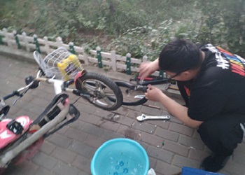活動開始前,志愿者們提前來到場地做準備,將他們的工具檢查一遍。活動中,修車小隊的成員們分工合作,有的拆裝鏈條,有的拆卸輪胎,有的專門為這些人搭手傳遞修理工具。修理工作有序進行,在大家的共同合作下,修車隊員將鏈條順利換掉,將拆卸下來的輪胎順利補好。在試騎確認車子可以正常運行且沒有其他故障后,又將其送到指定位置。隨后陸續有更多同學前來尋求幫助,活動順利的進行著。修車隊隊員們在此交流并學習了更多修車的技巧,享受著為同學服務帶來的愉悅。